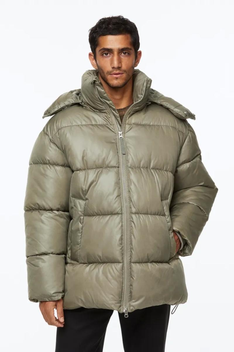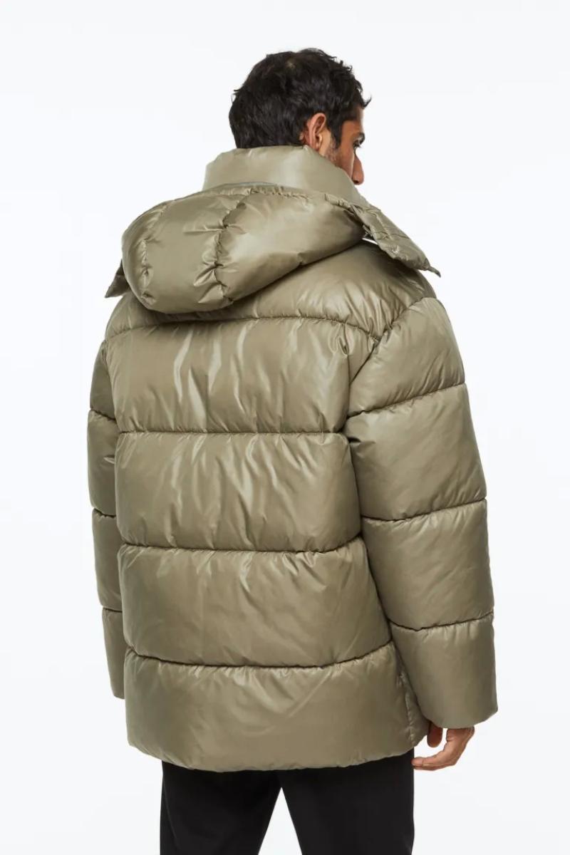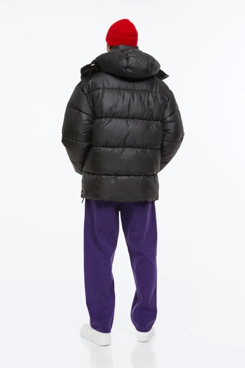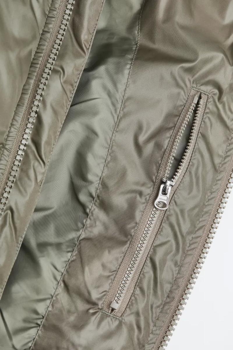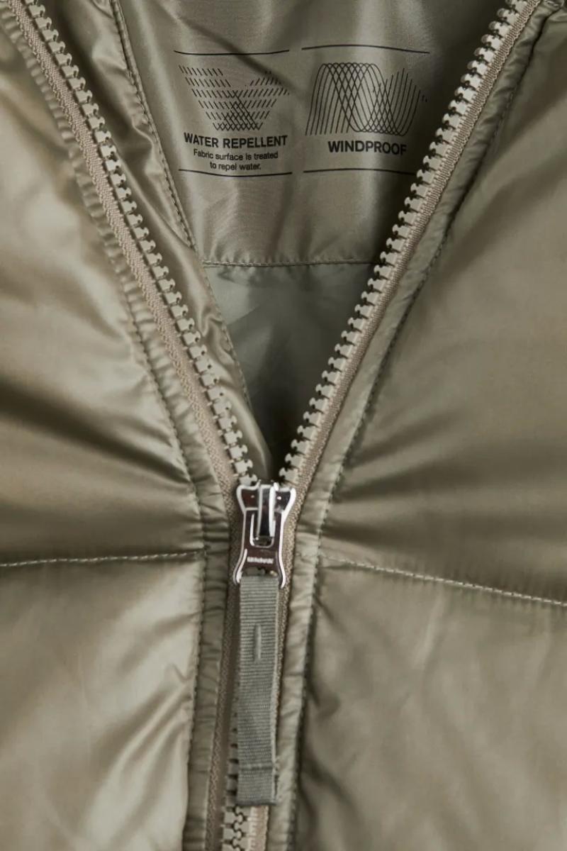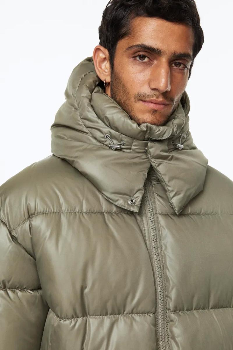 .جاكيت منفوش كبير الحجم من قماش مقاوم للرياح وطارد للماء..يحتوي على ياقة قائمة وغطاء برباط قابل للفصل..يحتوي على سحاب من الأمام مع واقي للذقن وأكمام طويل وأساور مضلعة..جيوب أمامية مائلة ملحومة مع أزرار ضغط مخفية وجيب داخلي بسحاب ورباط مرن مخفي عند الحاشية.