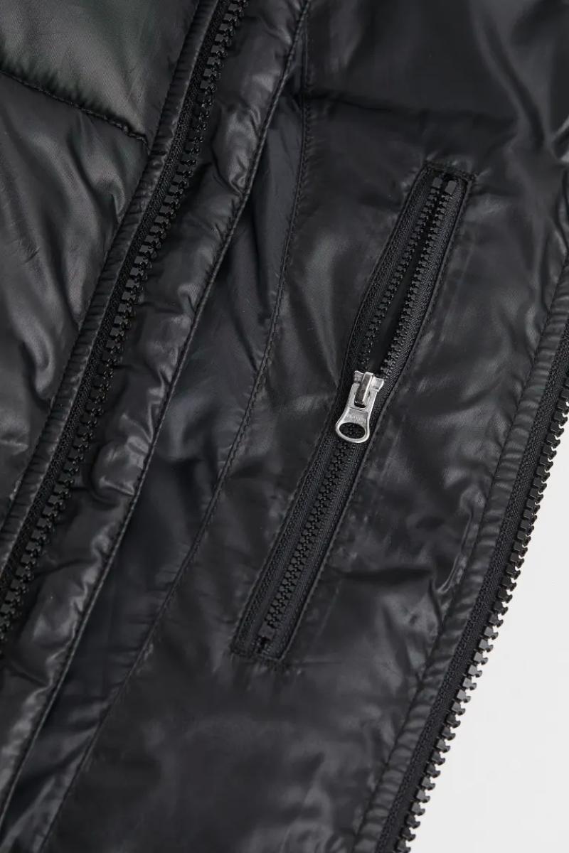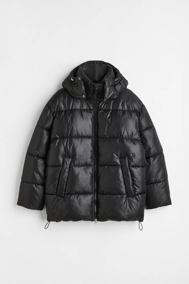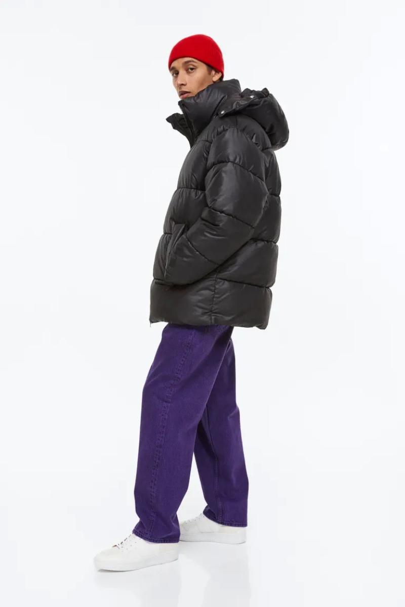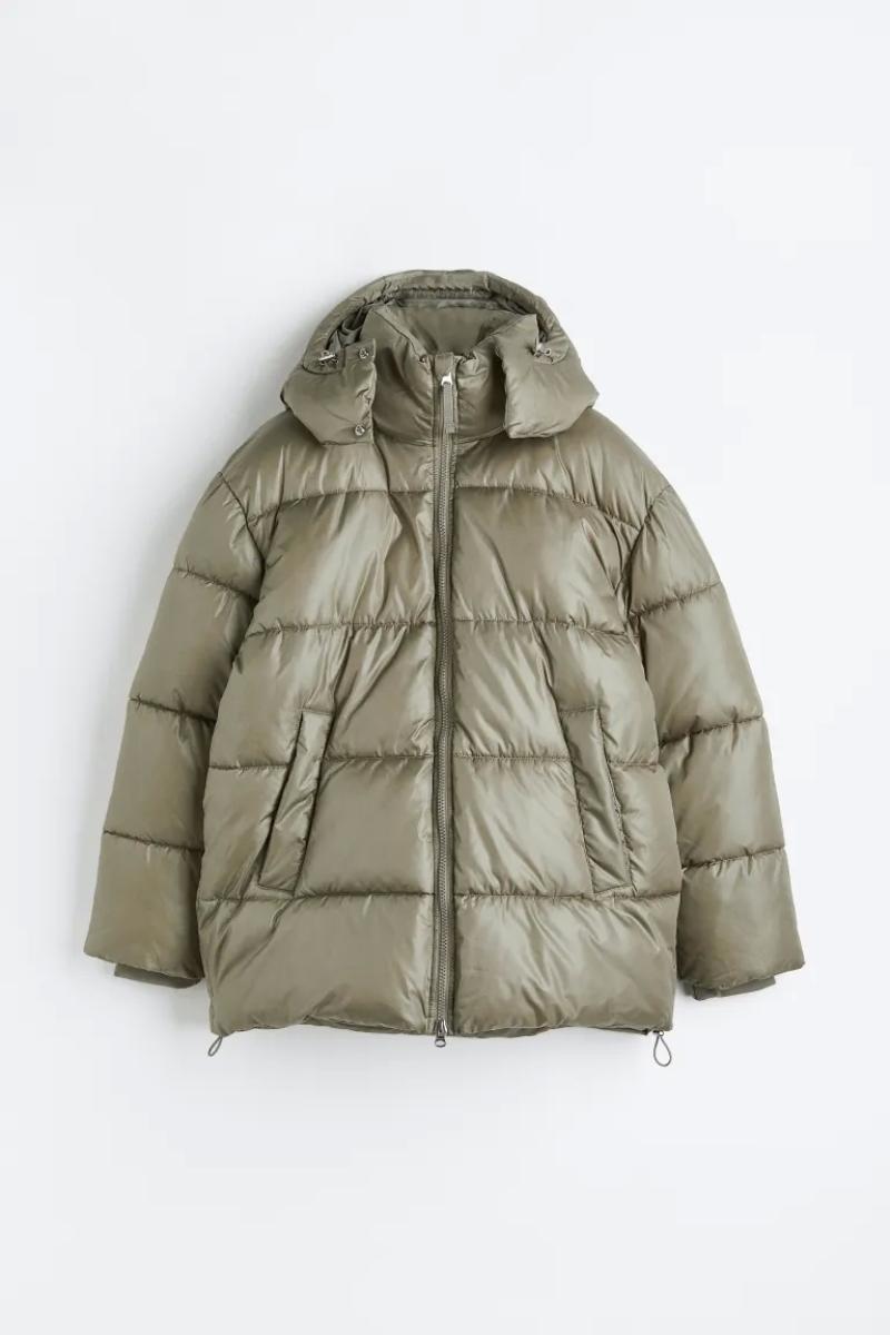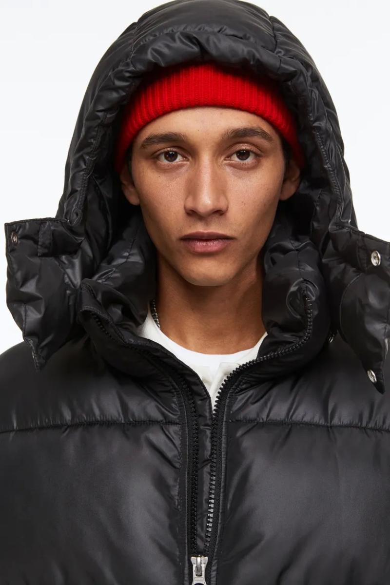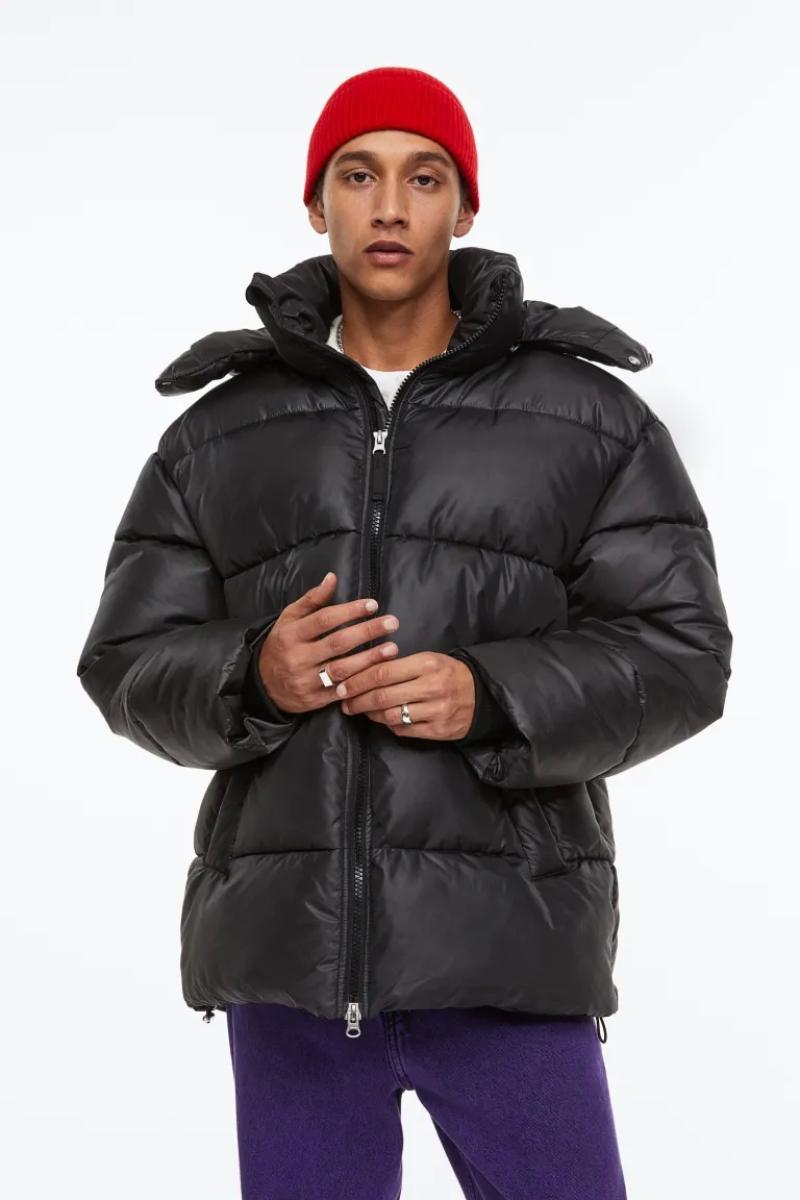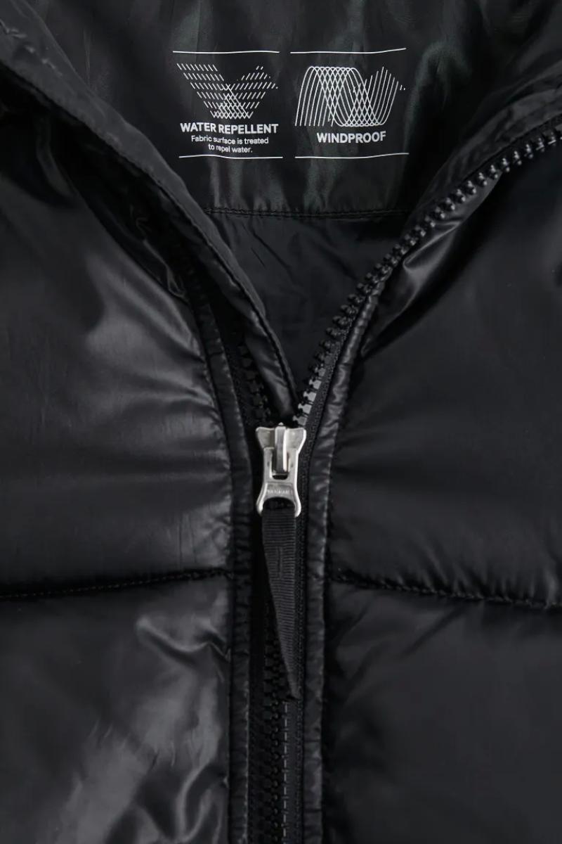 .جاكيت منفوش كبير الحجم من قماش مقاوم للرياح وطارد للماء..يحتوي على ياقة قائمة وغطاء برباط قابل للفصل..يحتوي على سحاب من الأمام مع واقي للذقن وأكمام طويل وأساور مضلعة..جيوب أمامية مائلة ملحومة مع أزرار ضغط مخفية وجيب داخلي بسحاب ورباط مرن مخفي عند الحاشية.